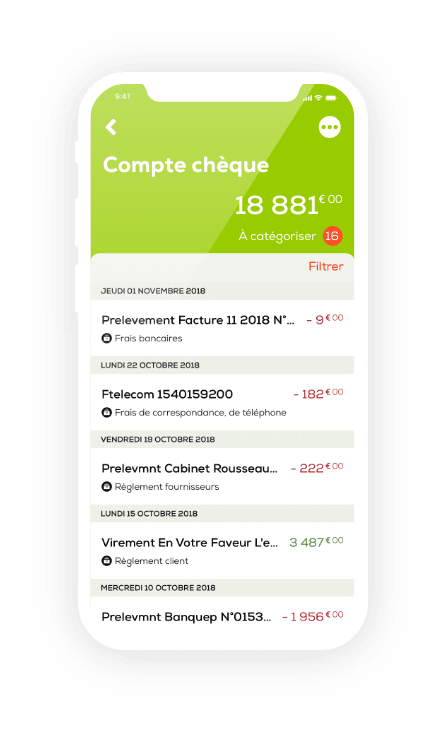 Connaissez la répartition de vos recettes et dépenses en justifiant et catégorisant toutes vos opérations bancaires. Une visualisation par catégorie vous permet de connaître vos postes de recettes et dépenses les plus importantes.